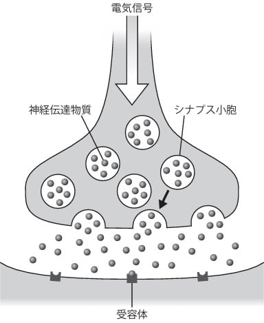 電気信号が軸索の末端まで伝わると 神経伝達物質が放出され、 それが隣のニューロン側で受け取られ、 信号が伝わります(図「シナプス」)。